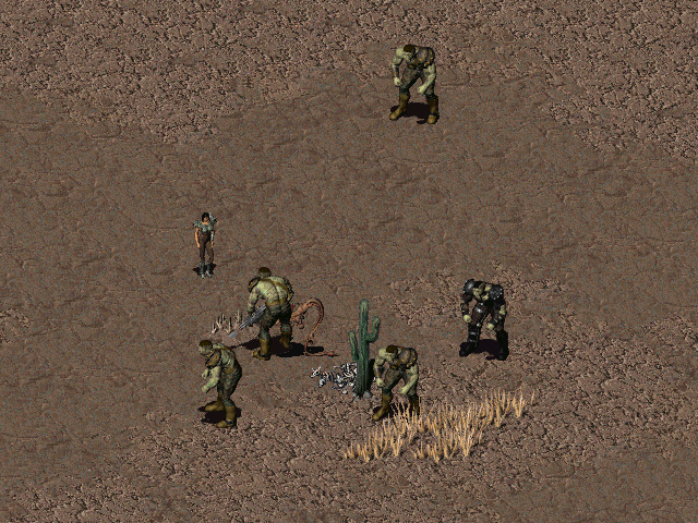 The Vault Dweller meets a group of between three to six super mutants around the Mariposa Military Base.