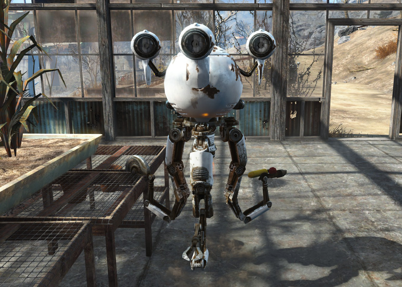 White, designed to be a supervisor of the garden, was also given sophisticated cognition processors, enabling her to be able to perform complex analysis and decision-making.[2] With the help of supervisors Greene and Brown, she ran the facility for over two centuries without a problem. In 2287, she has noticed lower water pressure in the facility as well as radiation-contaminated water coming in from the Weston water treatment plant and is looking for anyone willing to fix the problem.[3]