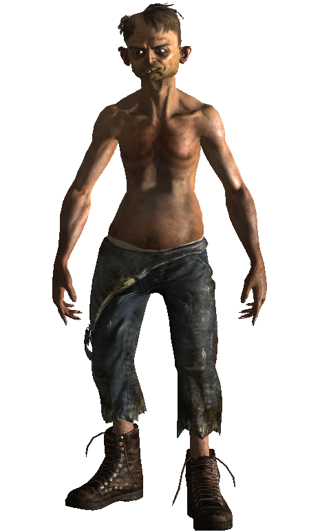 Scrappers are the smallest and weakest of the swampfolk. They are skinny with distended bellies and only wear pants and boots. They have somewhat more health than regular super mutants. They also appear to have the least amount of mutation/disfiguration on their skin and body (excluding their body structure) compared to the other swampfolk of Point Lookout.
