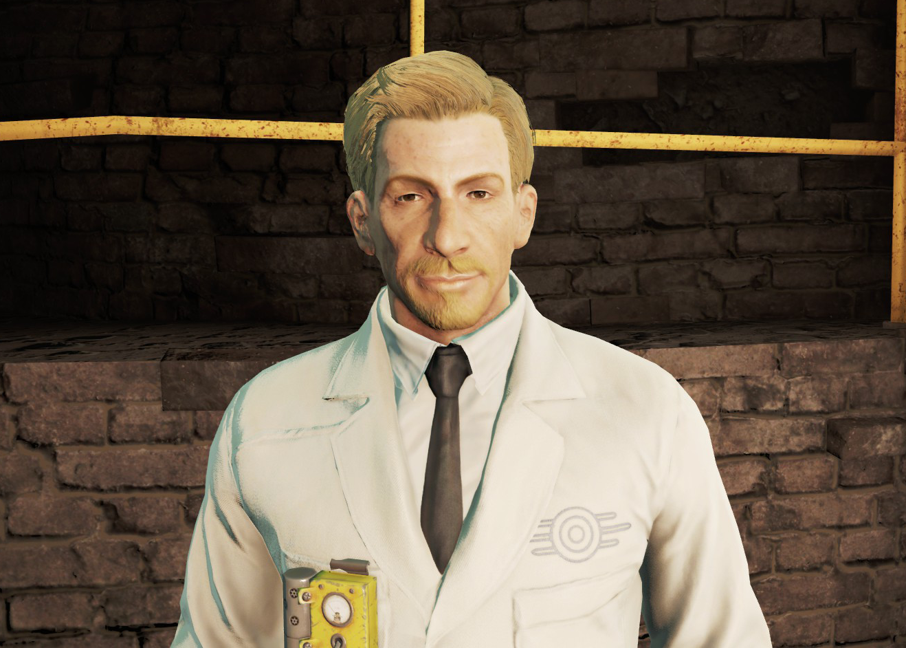 Blythe is one of the head researchers of the Compound, responsible for fine-tuning the questions and their impact on the test results. Noticeably, he is much less obsessed with detecting synths than his peers, and is clearly aware of the limitations of the SAFE test.[2] He sees it as unreliable as the original G.O.A.T., not to mention that it includes questions about baseball that no post-nuclear denizen can truthfully answer.[3] Furthermore, he is keenly aware that the limited resources of the Compound are effectively wasted by subsidizing trade in Covenant. Arguments that Penny Fitzgerald can simply hike the prices once they become critically low are not convincing him.[4][5]