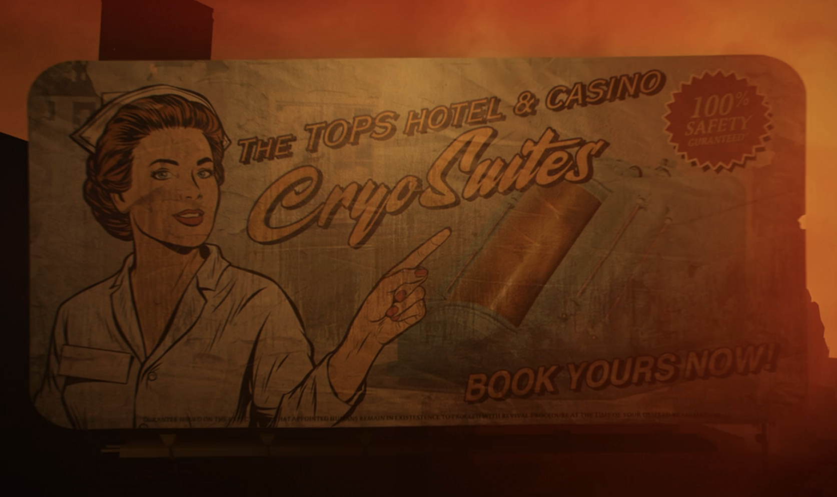 The credits sequence begins on a billboard advertising The Tops Hotel & Casino Cryo Suites, which are billed as "100% safety guaranteed." The camera pulls back to travel along the New Vegas Strip itself, showing a crashed NCR vertibird and human skeletons near the skeleton of a large, horned creature resembling a deathclaw. The buildings along the road are ruined, and the street is also filled with rubble and barricades. The camera passes through a destroyed gate along the city wall, with numerous destroyed Securitrons seen nearby and further outside. The Lucky 38 becomes visible at this point, while the shot ends after panning out far enough for the Fabulous New Vegas sign to become visible.