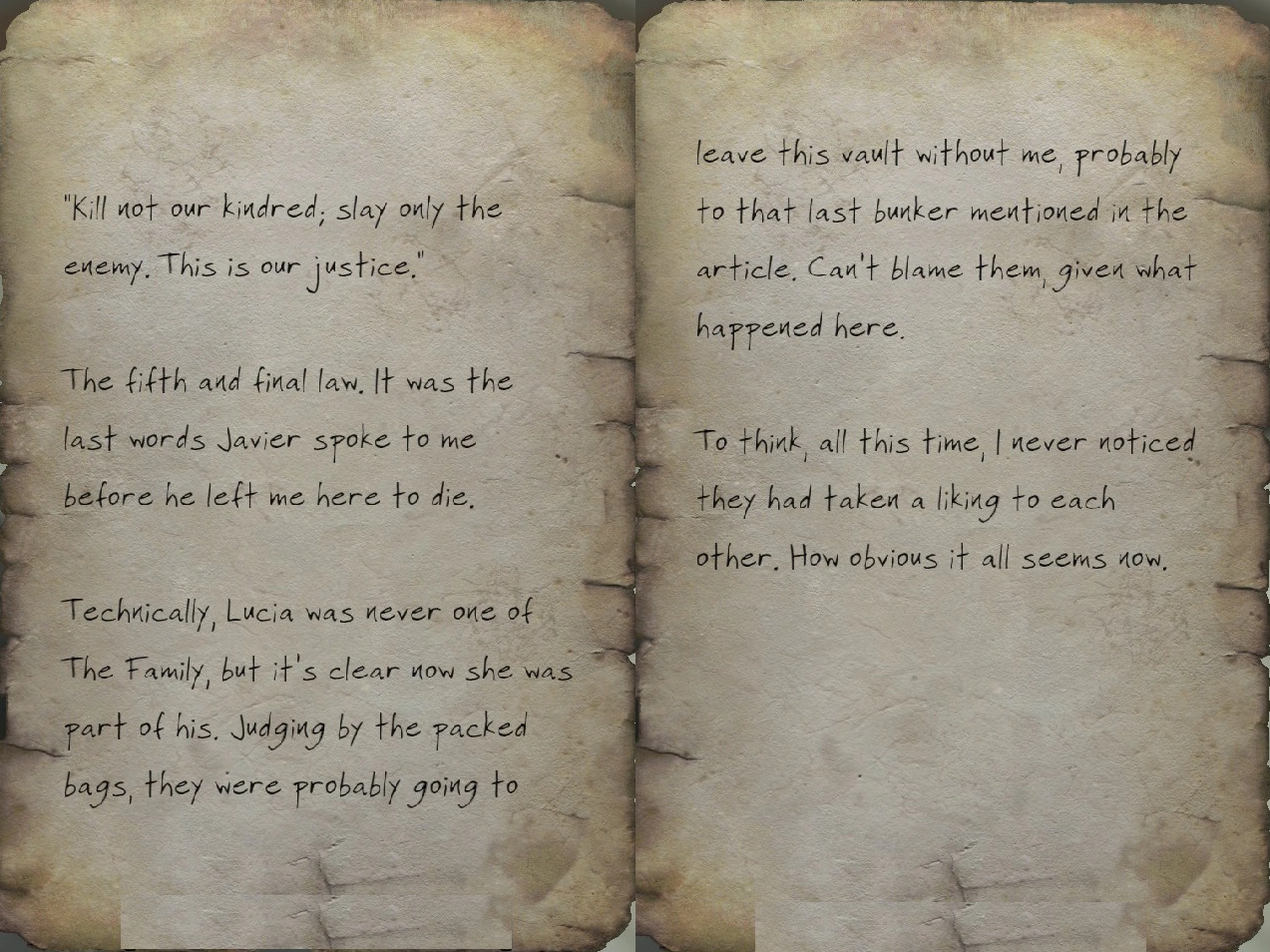Technically, Lucia was never one of The Family, but it's clear now she was part of his. Judging by the packed bags, they were probably going to leave this vault without me, probably to that last bunker mentioned in the article. Can't blame them, given what happened here.