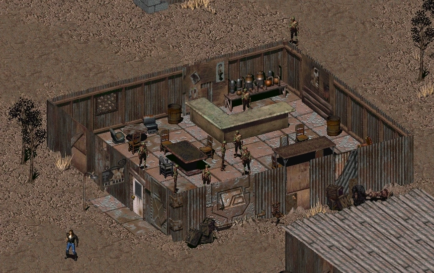 Situated alongside the reactor, it is a small building made up of a few small tables and chairs, run by Wooz. It sells irradiated liquor such as Gamma Gulp beer. Wooz is also Gecko's Tragic the Garnering addict and will play with the Chosen One if asked.