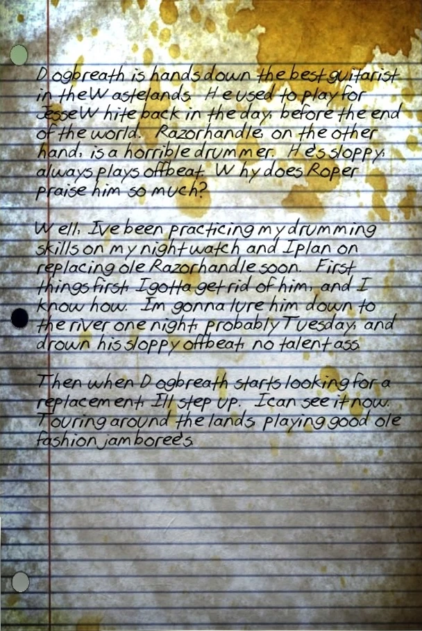 Dogbreath is hands down the best guitarist in the Wastelands. He used to play for Jesse White back in the day, before the end of the world. Razorhandle, on the other hand, is a horrible drummer. He's sloppy, always plays offbeat. Why does Roper praise him so much?