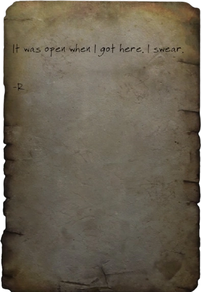 The note can be found in Charleston in a broken safe, inside of a destroyed red house along the Fire Breathers' training course after it descends to the street level. The house is east-southeast of the Hornwright Industrial headquarters.