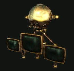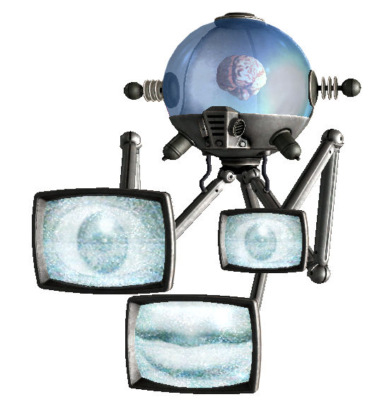 Consisting of a robotic sphere-shaped body housing a human brain, with three monitors attached to the robot's chassis, a think tank uses the same principle as a robobrain: the brain is held inside a hardened glass container at the top of the robotic body, suspended in pressurized bio med gel (which can take many colors). However, unlike a typical robobrain, the brain within a think tank never had its memory wiped, retaining all memories and emotions it would have had prior to becoming a think tank. The robotic body has three monitors varying in scale protruding from the robot's chassis. Two of these monitors depict eyes and the other depicts a mouth. In addition to allowing a person to continue living by using their brain as a power source, it provides a container and mobile platform so the operating human brain may observe and approach various items. Like eyebots, think tanks levitate by means of an unspecified propulsion system.