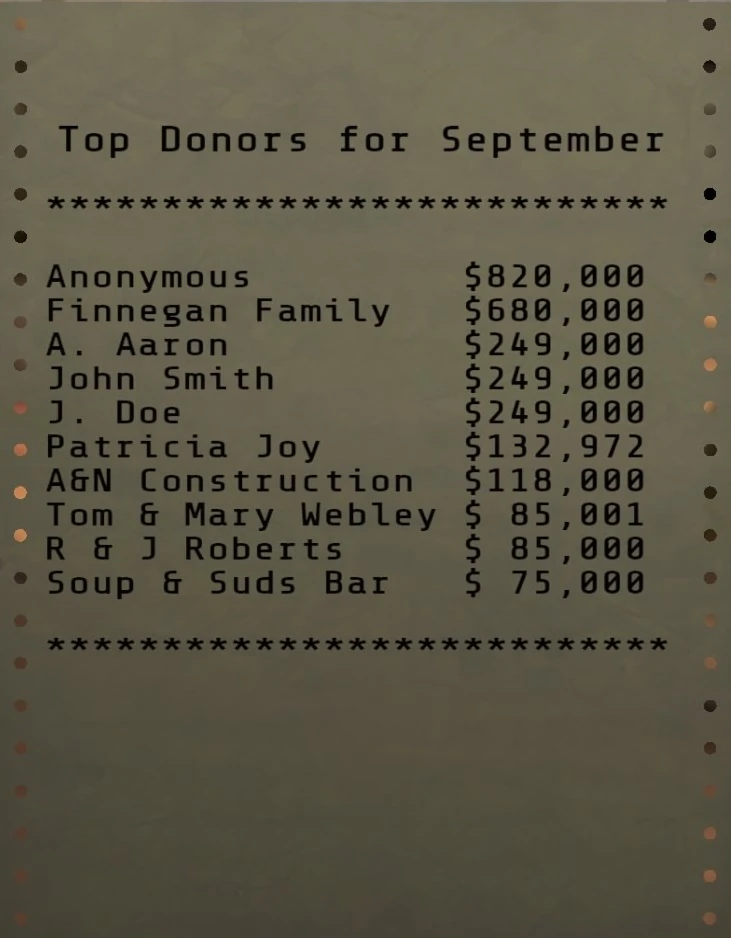 Top donors is a paper note in Fallout 76, introduced in the Expeditions: The Pitt update.