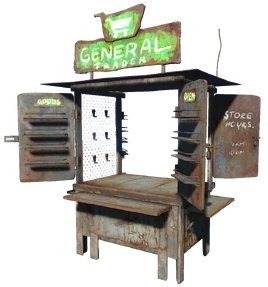 The trading stand, trading shop and trading emporium are constructible settlement stores in Fallout 4.
