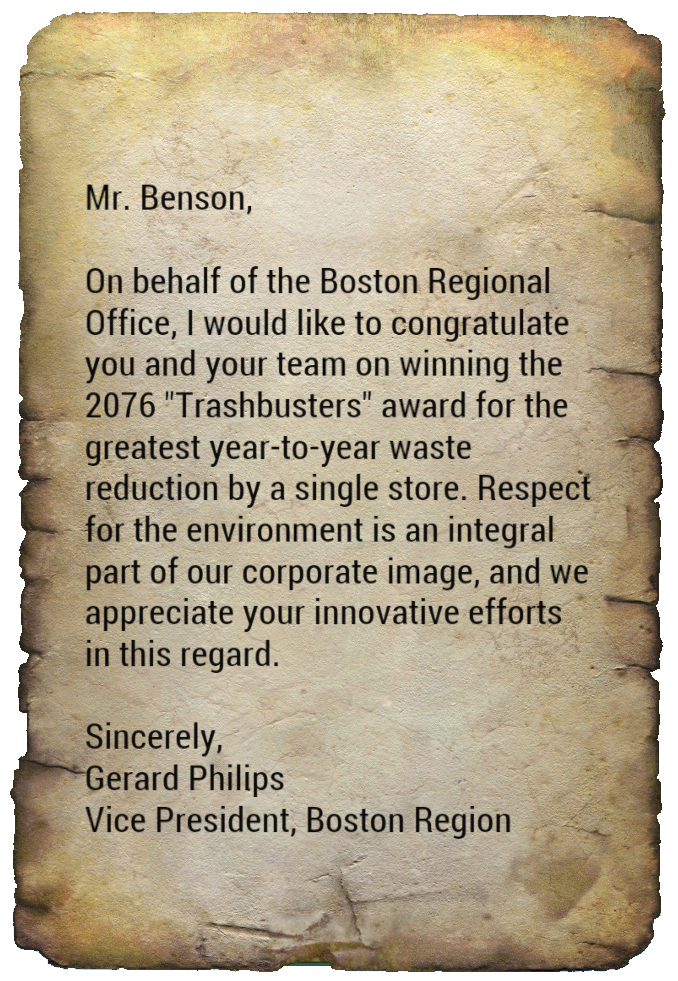 On behalf of the Boston Regional Office, I would like to congratulate you and your team on winning the 2076 "Trashbusters" award for the greatest year-to-year waste reduction by a single store. Respect for the environment is an integral part of our corporate image, and we appreciate your innovative efforts in this regard.