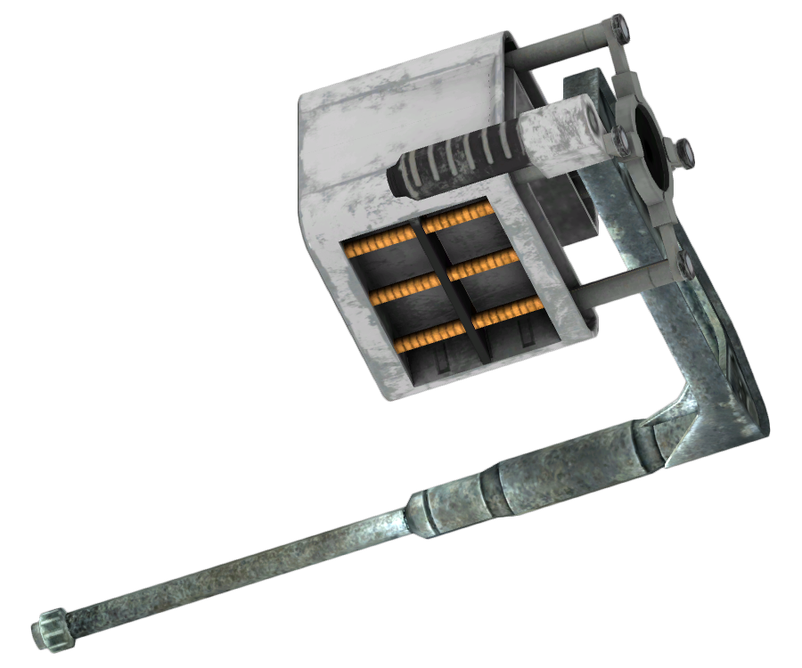 Items Weapons (Non-unique) 12.7mm submachine gun · 25mm grenade APW · 5.56mm pistol · Anti-materiel rifle · Assault carbine · Baseball bat · Battle rifle · Chainsaw · Fat Man · Fat mine · Hunting revolver · Katana · Laser pistol · MFC cluster · MFC grenade · Nuka-grenade · Plasma Defender · Plasma pistol · Power fist · Ripper · Time bomb, high yield · Tin grenade · Tri-beam laser rifle Weapons (Unique) Bozar · Cleansing Flame · Embrace of the Mantis King! ·