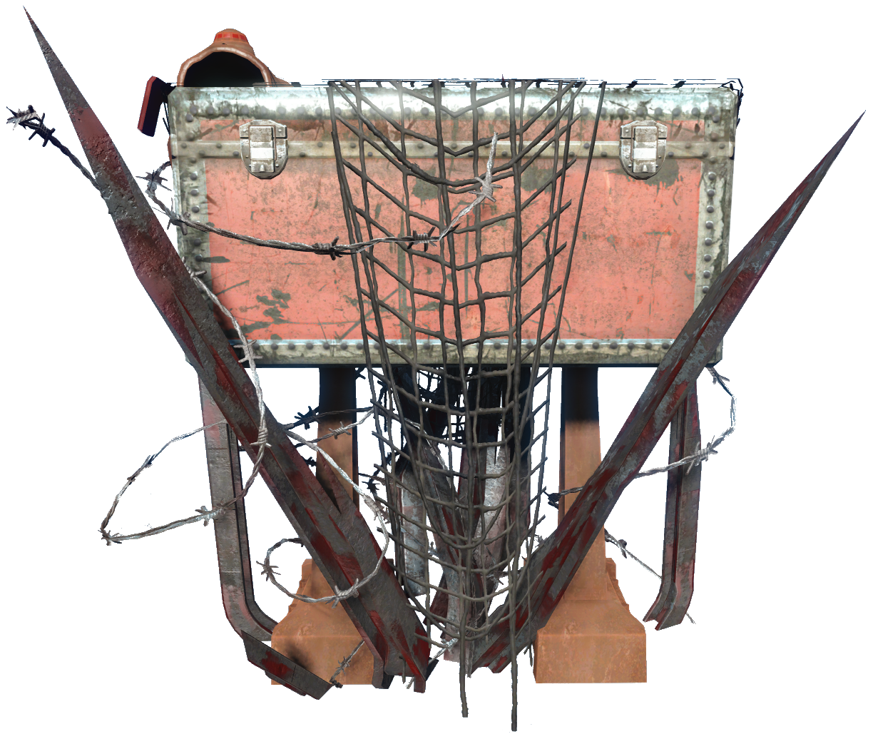 The tribute chest appears as a red steamer trunk placed on a makeshift pedestal constructed from metal parts and metal poles, surrounded by barbed wire. A metal mailbox is attached to the top.
