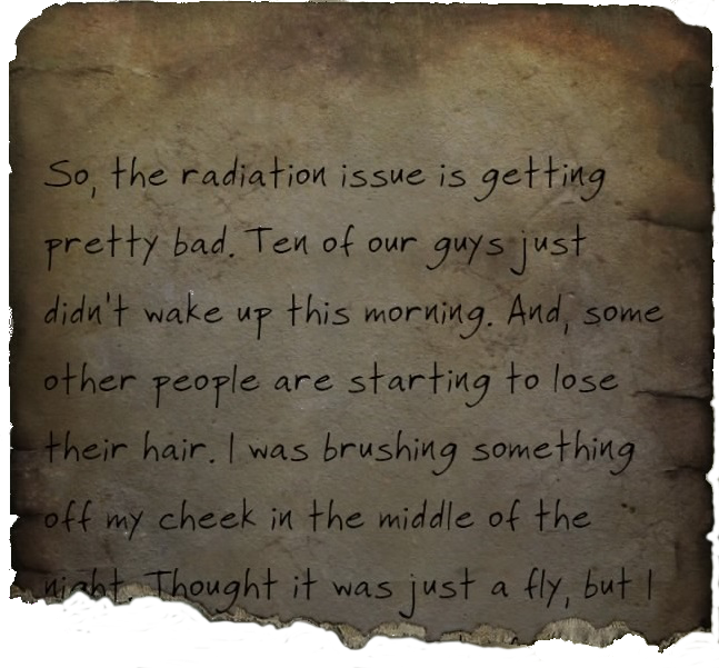 So, the radiation issue is getting pretty bad. Ten of our guys just didn't wake up this morning. And some other people are starting to lose their hair. I was brushing something off my cheek in the middle of the night. Thought it was just a fly, but I