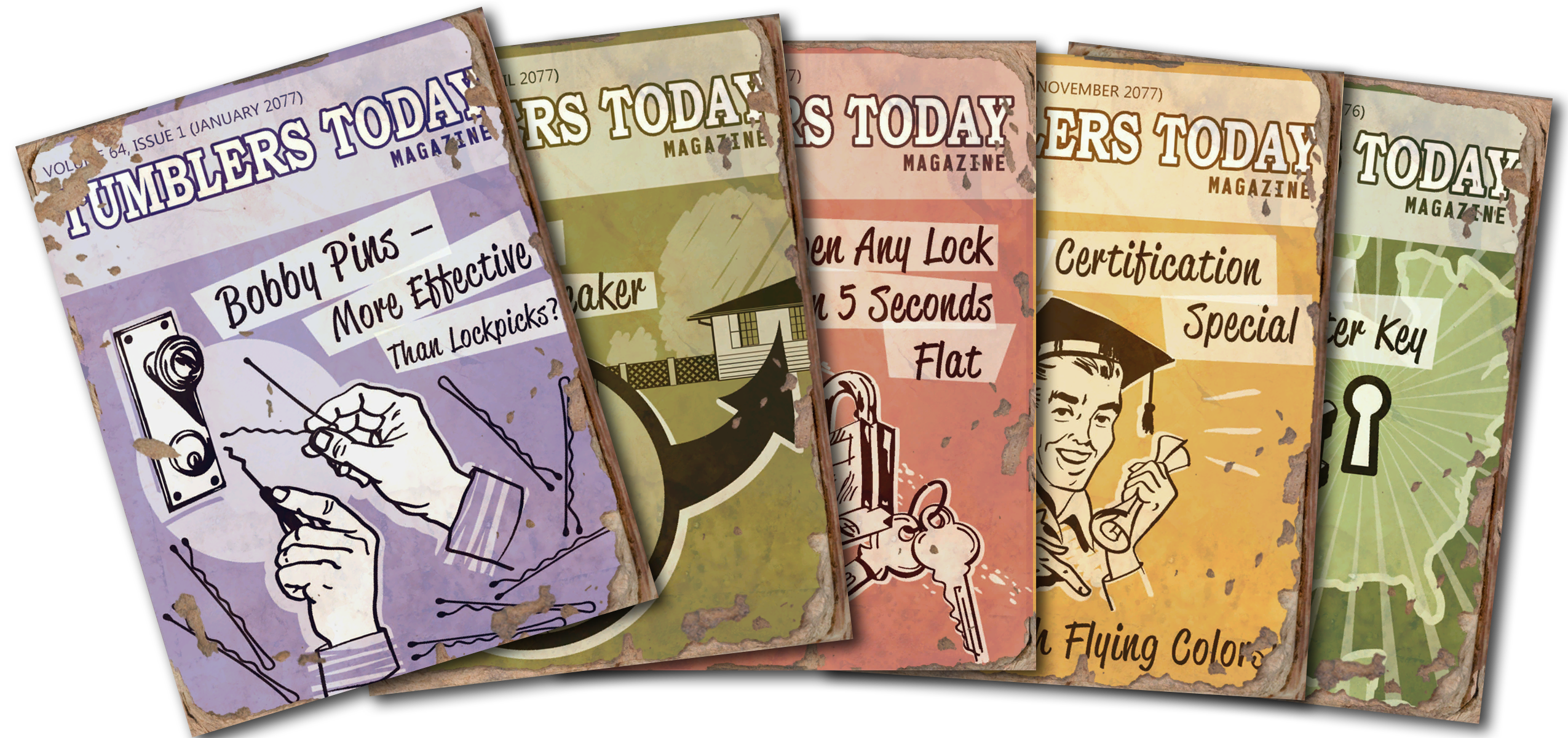 Tumblers Today is a pre-War containing information about the clandestine art of locksmithing or rather information of the latest in mechanical locks found in safes, footlockers, and doors. The information inside was intended for commercial purposes, but can be applied to picking locks as much as it can be applied to making locks. The cover art for the magazine depicts imagery from each issue, highlighting the topic and technique of the issue.