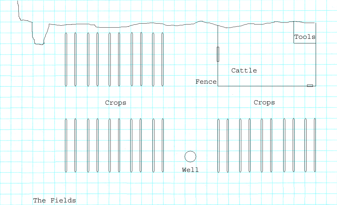 Nestled against the wall of a box canyon are the crop fields, The fields surround a small animal pen that houses sheep, cattle, and a tool shed. A nearby well irrigates the crops and provides water for the livestock as well.[1]