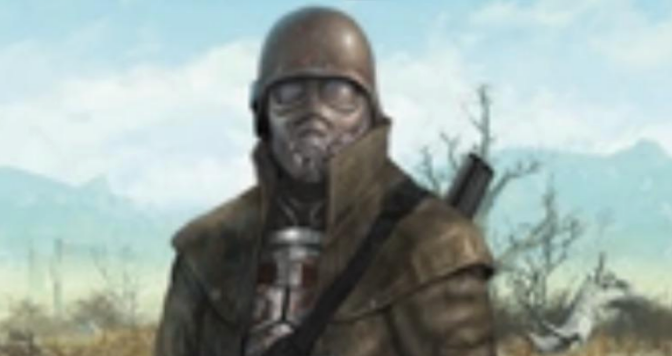 Complimenting his time as a Desert Ranger, Tycho wears a recolored model of pre-War riot gear including body armor and a gas mask; others of its type were used by wastelanders such as the Vault 76 dwellers in Appalachia on the East Coast and survivalist Randall Clark in Utah. This sturdy model would eventually be appropriated by the New California Republic and adopted as armaments for the veteran members of their own Ranger organization.[33] On top of his armor, Tycho carries all the necessary survival gear like a knife, brass knuckles, a water canteen, and a pair of goggles to keep his eyes safe when not wearing his gas mask. His trenchcoat is sand-colored for reasons of camouflage and doubles as protection against sand and glare from the sun.[Non-game 1]