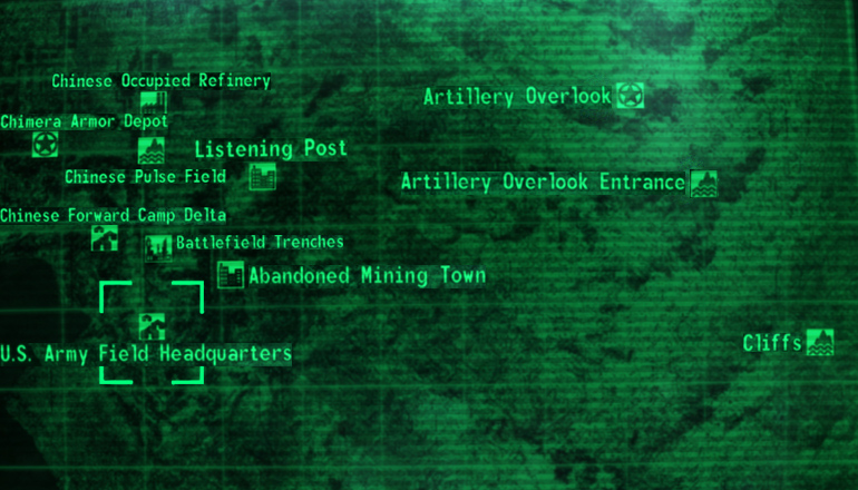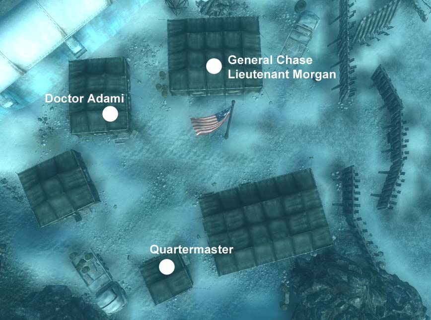 The command tent is west of the flagpole, and the open tent containing the T-51b power armor is northeast of the flagpole. The quartermaster's tent is east of the flagpole, and the workout tent is south-southeast of the flagpole. Dr. Adami's tent is south-southwest of the flagpole, and the entrance is to the north of the flagpole.