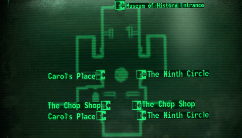 Immediately inside of the entryway is a large statue. Tulip's general store, Underworld Outfitters, is on the left and Winthrop's office is to the right in the back corner. Doctor Barrows' clinic, the Chop Shop, is located on the far wall. Heading up either set of stairs will take the Lone Wanderer to the second floor balcony. On the left is the Ninth Circle, a bar run by Ahzrukhal. On the right is Carol's Place, where the player character can rent a room or purchase food.