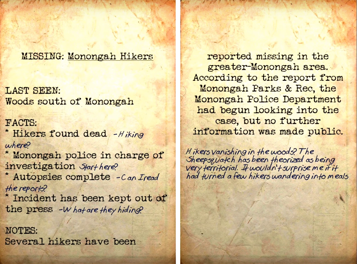 Unsolved: Missing hikers are two paper notes in the Fallout 76 update Wild Appalachia. Reading either of them starts the Unsolved: Tracking Terror quest. They can not be picked up.