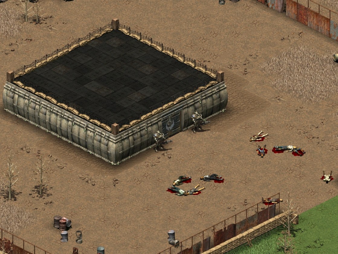In this encounter, you'll find two Brotherhood of Steel Paladins, Hubert and McCarthy, standing outside of a BOS bunker reminiscent of ones found in Fallout and Fallout 2. The two Paladins have apparently killed a large number of civilians who were trying to gain access to the bunker.
