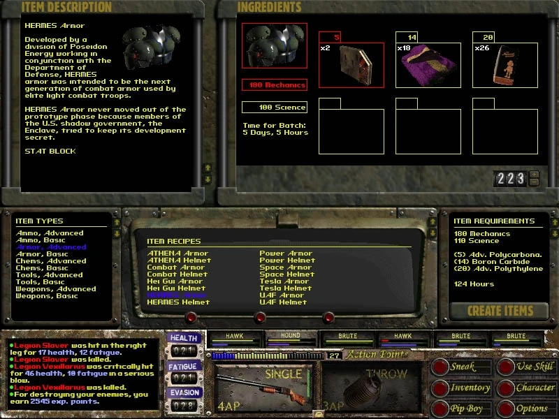 According to Van Buren's batch screen, it was planned to enable crafting of 160 items, divided into ten categories: ammo, armor, chems, tools, weapons (advanced and basic).[1]
