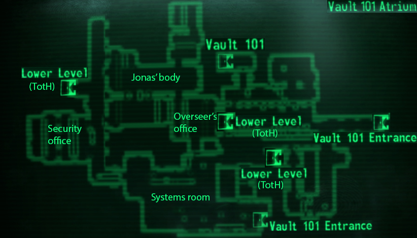 Vault 101 is divided into four sections, including the main entrance, overseer's tunnel, atrium/upper level, and the lower level. The sections are separated by doors, and stairways connect floors and levels within two of the sections. Levels and rooms are identified by signs. There are two paths to the Capital Wasteland, including a direct path from the atrium and a hidden tunnel named the overseer's tunnel. The sections are not directly stacked upon each other. They are staggered with each section moving progressively more westward as the Vault burrows deeper into the earth.