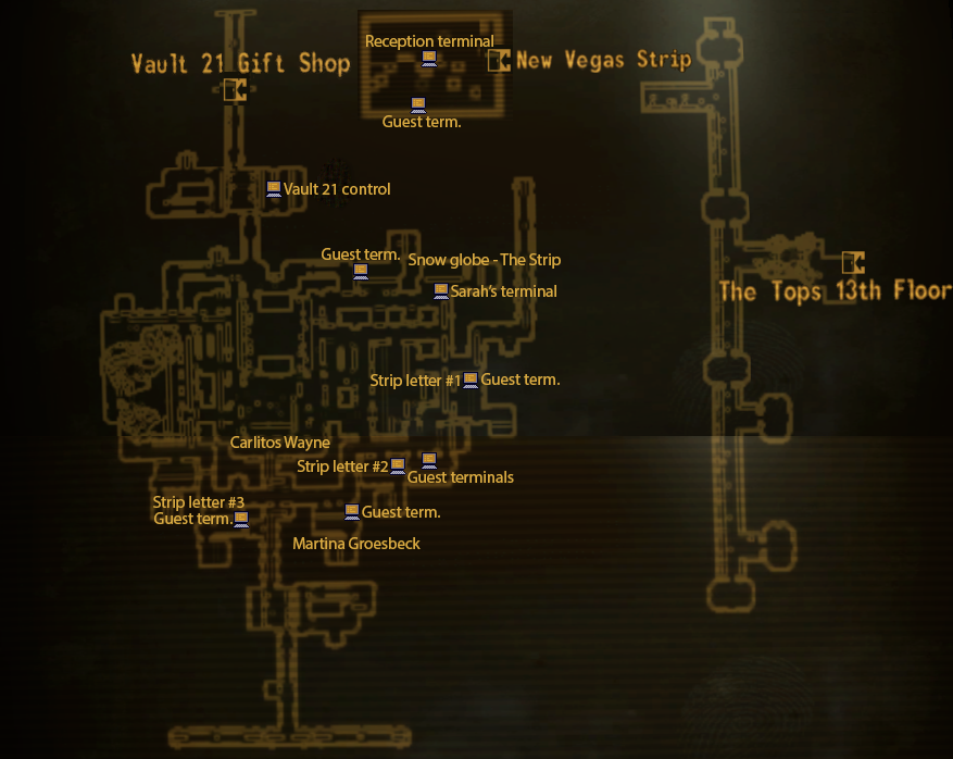 Inside the Vault, there is a central atrium with two Blackjack tables, a hallway with living quarters, including Sarah's room and a guest room that the player character can rent. Another door leads to the cafeteria/diner. The lower levels were filled with concrete by Mr. House and are inaccessible except for the maintenance level, which is accessible from the basement of The Tops.[6] This level consists of a long hallway with a few small rooms branching off of it. The elevator in Benny's suite leading to it is locked unless he is attacked in the Tops presidential suite, and the tunnel ends in another locked door. The tunnel runs under the outer wall of the Strip.[Non-game 2]