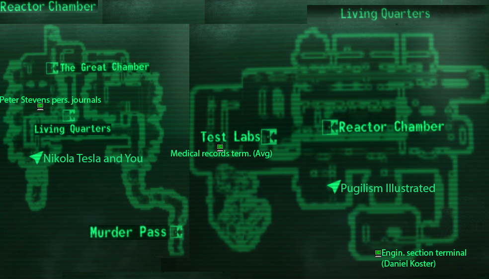 - A copy of Nikola Tesla and You - In a wooden box at the feet of a mannequin in the southwesternmost dead-end tunnel of the reactor chamber, along with four bottles of whiskey (from the Murder Pass entrance, turn left and go downstairs, turn left again, then through the door at the end of the corridor).