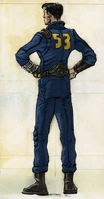 Overall, the vault suit seems to represent an Everyman/Everywoman uniform of conformity, and a blank canvas for accessorizing once the wearer had escaped into the harsh environment of the wasteland. Preserving the retro 50’s flavor seemed to support this, and I wanted the suit to feel at home in a classic 50’s sci-fi film like Forbidden Planet. The reinforced elbows and knees seemed to introduce a bit of that flair to the otherwise oppressively Orwellian environment." - ↑ Conceptual Design blog