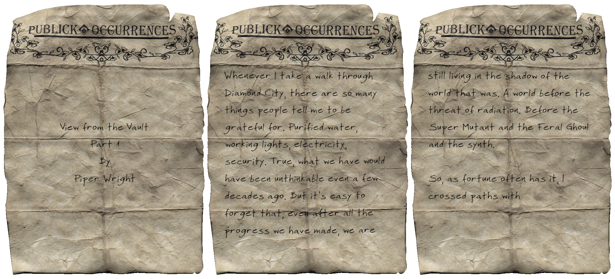 The note can be given along with Parts 2 and 3 to the player character by talking to Nat outside the Publick Occurrences building in Diamond City, only after completing Story of the Century for Piper and 24 in-game hours have passed. The version of the transcript received is dependent on the player character's chosen gender and the answers given to Piper during the interview.