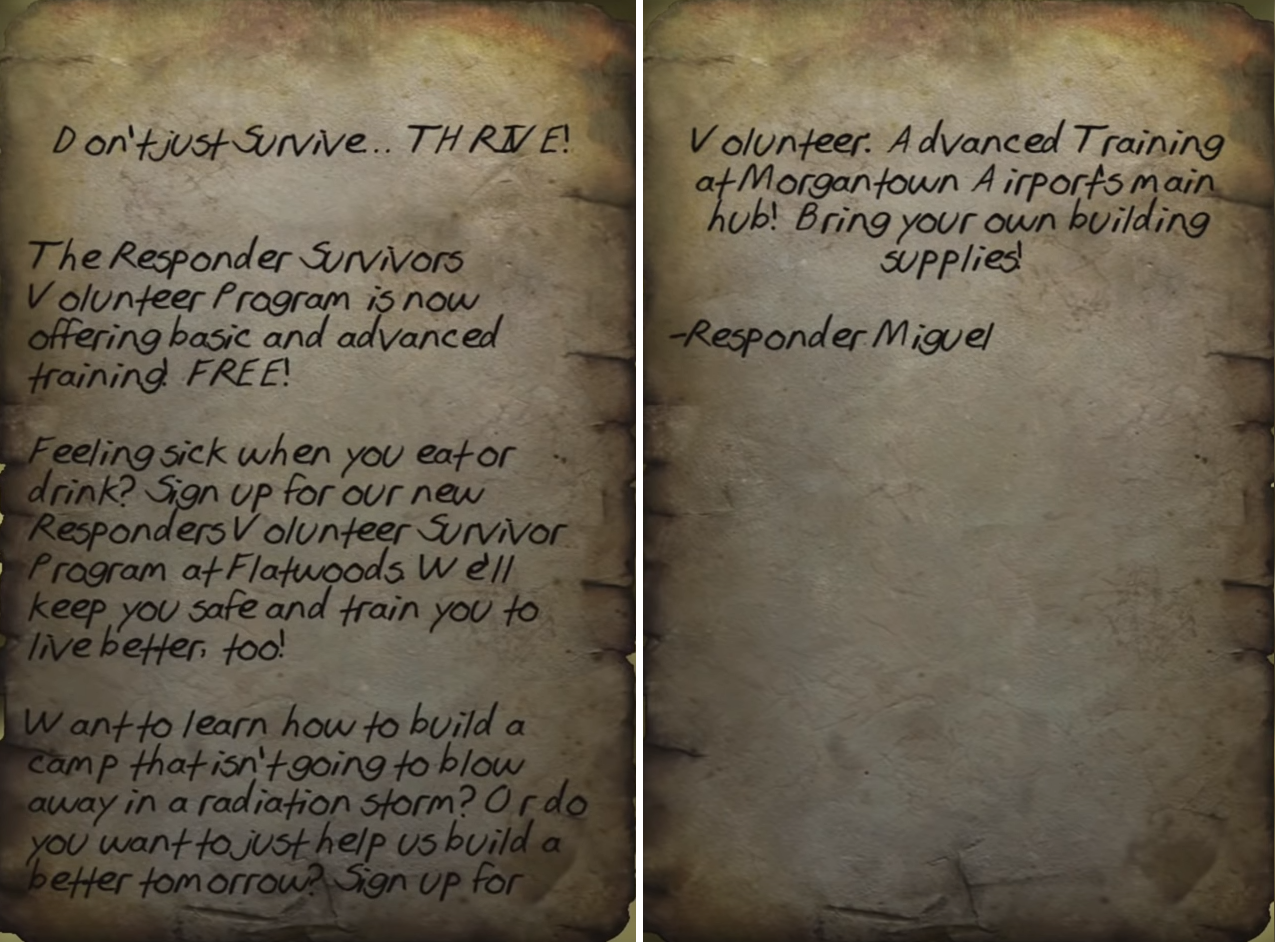 - The note could previously be found on a civilian or Responder volunteer in the Merchant Killed by Scorched random encounter, or the Survivor Camp vs Supermutants random encounter, but both encounters were removed from the game.