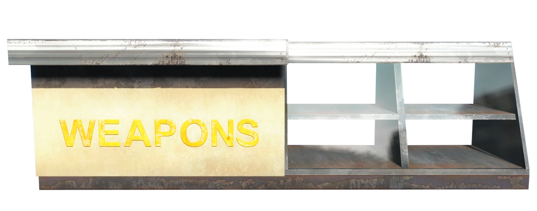 The outdoor weapons stand has 3 bullets painted on the sign fixed to the top of the crossbar and a sign with "weapons" hanging underneath on the right-hand side. The store counter has the "weapons" written across the front in yellow capitals.