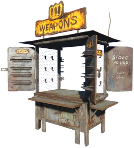 The weapons stores are tiered weapons merchant stores, which can be constructed in settlements via the workshop. A settler must be assigned to the weapons stand in order to function as a store and increase settlement happiness.
