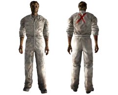 It provides a Damage Threshold of 1 and grants a bonus of 5 to the repair skill. It is a light gray jumpsuit with a red "X" on the back, identical to the Dead Money jumpsuit . This indicates that Elijah took these suits from the dead Yangtze camp survivors that he tested the detonator collars on and gave them to the prisoners he used to break into the Sierra Madre .