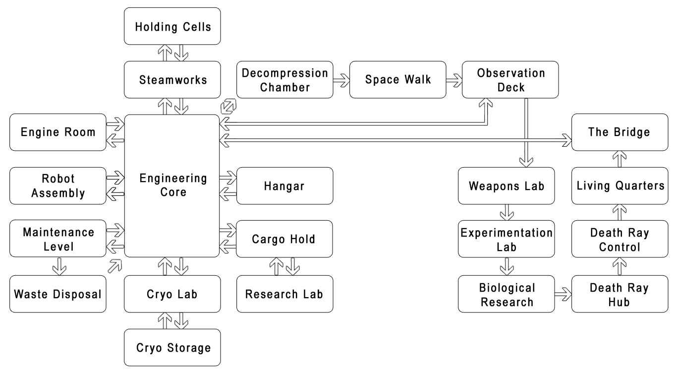 Aside from living quarters for the crew and the bridge, the remainder of the vessel is dedicated to the ship's basic functions. The engineering core in the lower part of the ship provides access to most of the maintenance sections like the maintenance level, engine room, or waste disposal. In the robot assembly, the various alien drones are produced and repaired.