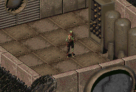 - ↑ Zomak's character description: "{102}{}{You see a big, burly ghoul whose face, beneath a sharply sloping forehead, reflects vast reserves of simpleminded superiority.}"