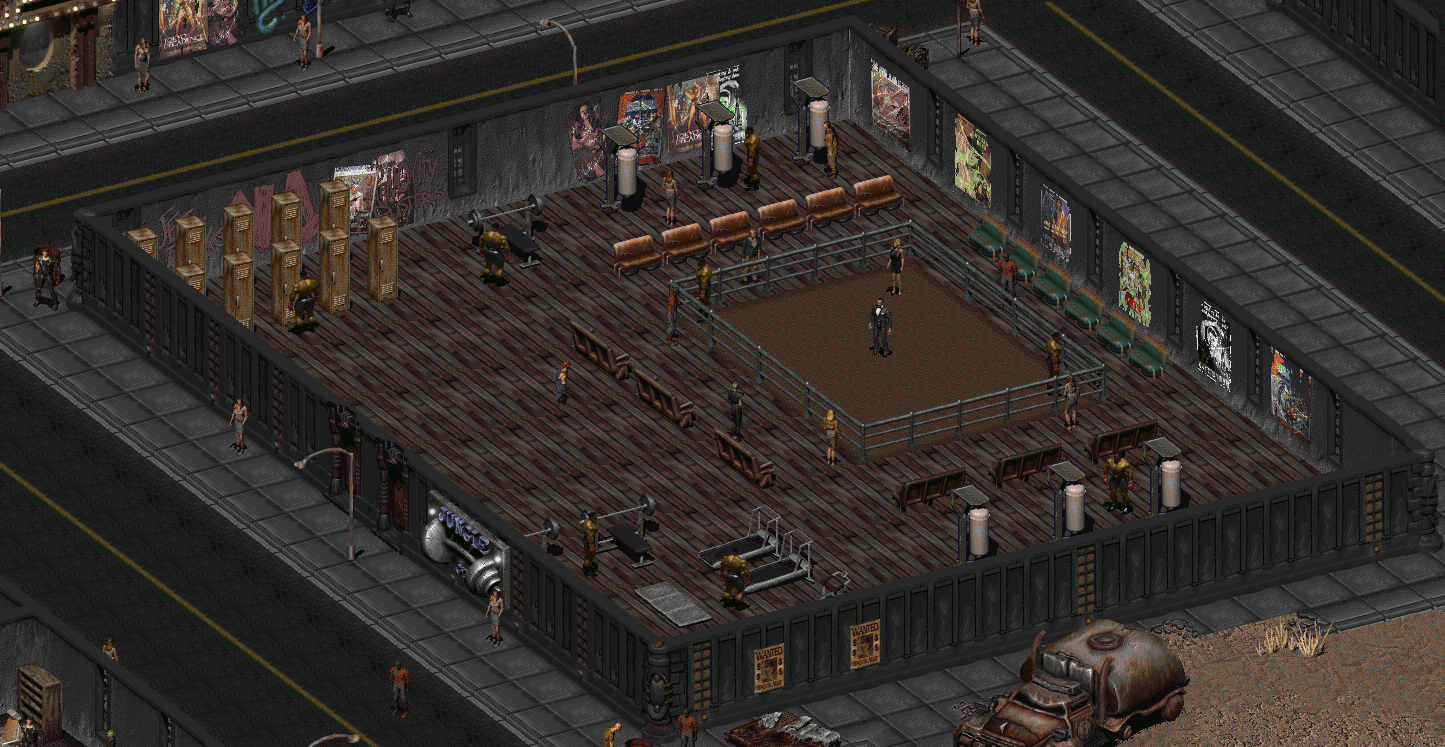 Situated on Second Street in New Reno, the Jungle Gym has produced many - if not all - of the post-nuclear wasteland's prizefighters, including the (in)famous Mike "The Masticator." Just south of the Shark Club casino, home of the Bishops, and across Second Street from the Golden Globes studio, the Jungle can provide a brief career opportunity for someone with strength, guts, and a malfunctioning survival instinct.