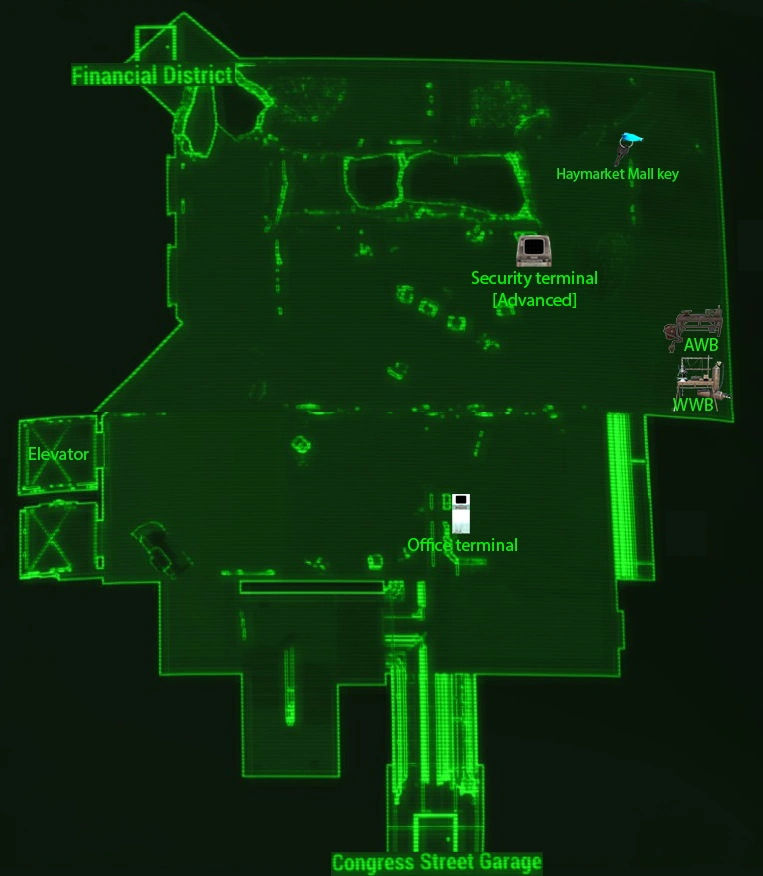 An Expert locked door to the Congress Street garage, an unmarked underground parking garage, can be found in the back of the building. This door can be unlocked by the Haymarket Mall key, which is carried by a random raider inside the building.