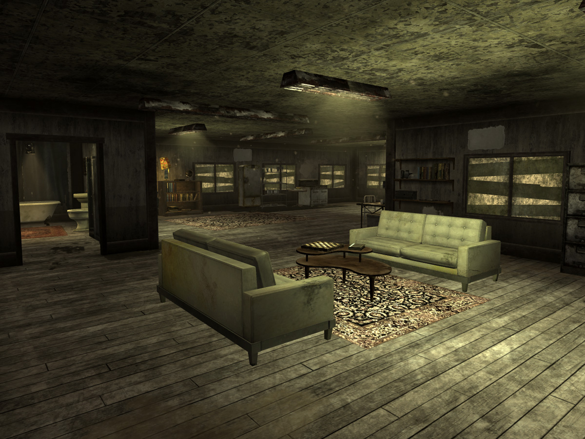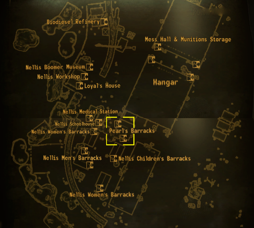 Situated opposite the southwest face of the Nellis hangars, the building serves as the personal quarters of the Boomers' leader Pearl. It consists of the main room with lockers and bookcases, Pearl's bedroom, and a bathroom in the back corner. The sink and toilet found in the bathroom provide fresh water with no risk of radiation poisoning.
