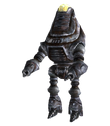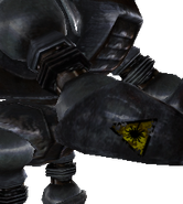 These heavy duty industrial robots feature a reinforced "head", a cage on their backs to help guard the combat inhibitor and a distinctive yellow coloring. Markings on the left side of the "head" read CP 1143-85. This model of Protectron can be found in the Pitt steelyard, the Pitt underground and in the supply plant.