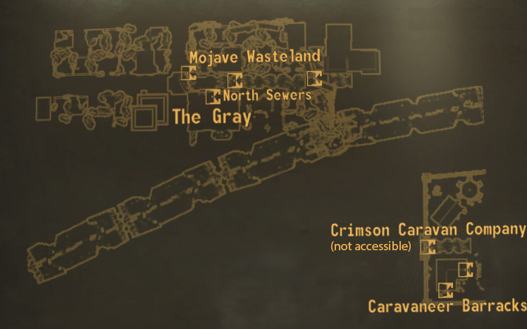 The fragmented citizens of New Vegas have sealed themselves into different defensible quadrants, and this tactic is just as apparent at the Junk Doors leading into North Vegas Square. Enter North Vegas Square [2B] to meet its citizens, including their self-imposed leader Crandon, and the only other Primary Location, The Gray [2B.01]."