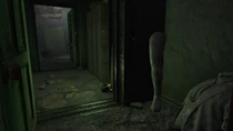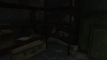 Turning back and leaving the hallway, head up the rubble to the top floor. Here there is another door leading into a small room with a chemistry station, a mattress and an Advanced-locked safe.