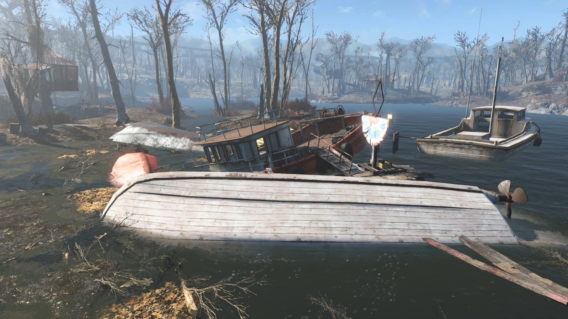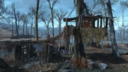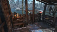 There are several boats forming a bridge across the river. Several mirelurks , possibly some ghouls, and three or four mirelurk kings can be found around the boats. There is a shack on the west side of the river with some minor loot and mines around it. A boat on the north side of the boat-bridge contains a Master-locked safe and an industrial trunk. Some more minor loot can be found inside of the trailer on the east side of the river behind the locked door. There is also a truck underwater that can be unlocked and contains various loot.