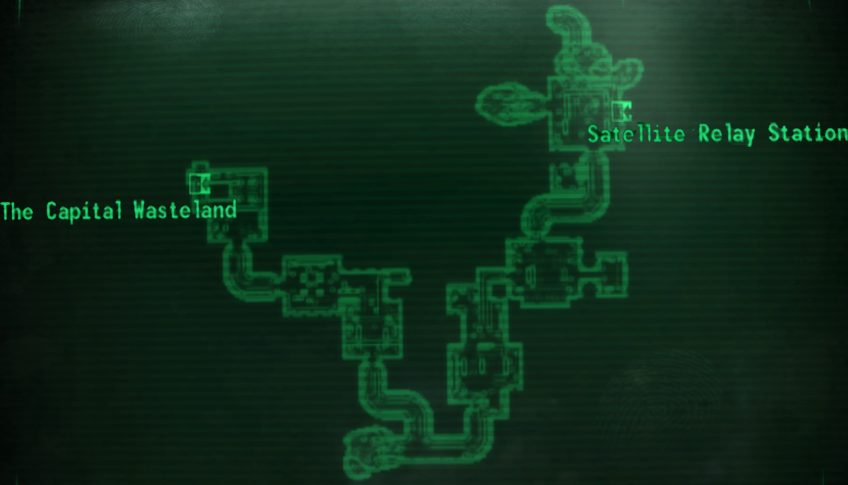 该设施占地面积相当地广,不过内部结构却并不复杂,三座天线塔楼的基层之间由一条主通道简单地联通,在其中有英克雷士兵守卫。该设施的主入口被瓦砾掩埋,The only way further inside the building is 一条维护用的通道with a small locker room on the side which ends in a room with generators, computers and a metal staircase leading upwards. While the intermediary level holds nothing of interest, the topmost level has a room with some tables and more computers on the one side and a small corridor on the other. After passing by yet another computer room, the corridor ends in another staircase, this time leading downwards. At the bottom level, there is a storage room or lounge connected to another service tunnel. Featuring a lot of crates and a barricade, the tunnel opens out into a room with pipes on its floor. Yet another metal staircase leads to a room with microfiche readers and more computers with a small bathroom on the side. A large door at the end reveals the next service tunnel which is fairly short and ends in a computer room with a Satellite Uplink terminal. Stairs guarded by an automated turret lead to the building's other exit to the Capital Wasteland, up a cliff north of Rockland car tunnel.