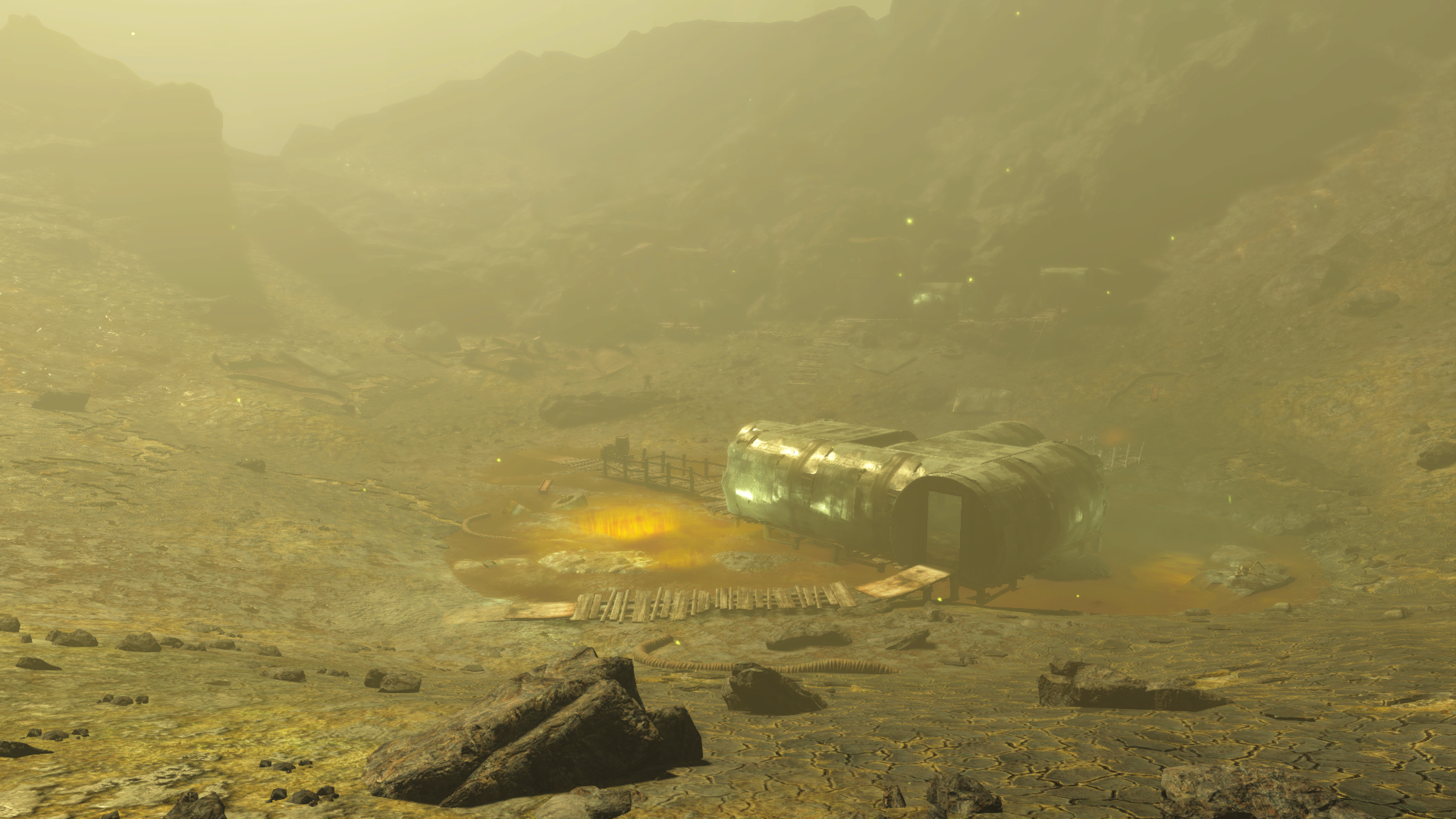Within the crater is a metal shack and some wooden cabins and structures, presumably built by the Children of Atom.