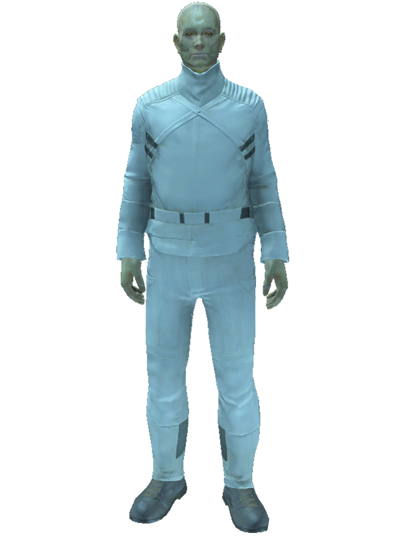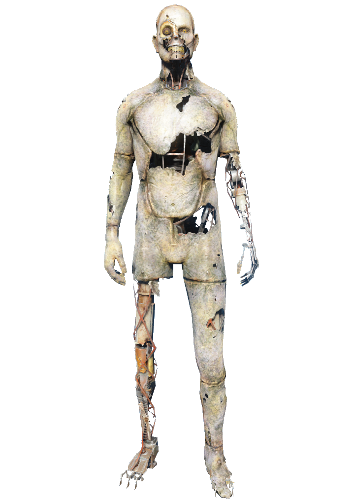 - 第二代 看上去和第一代差不多,防御也更高,在他们的机械骨架上也有了覆盖在一层薄金属板上的塑料肉体。尽管确实更像人了,但智能有限的他们那些病态的灰黄色皮肤上的接缝让他们看起来来更像是塑料模型。他们的表皮更加脆弱,击打与射击很容易就会让它们暴露出里面的机械装置。这些合成人经常穿着合成人护甲,而在学院里则是穿着学院连身服。他们仍然操着机器声音,但是比一代合成人的语音听上去流利很多。