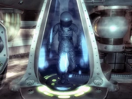 Hartigan was returning from a low-orbit mission in his capsule Clarabella 7, but he never made it back to its ocean splashdown rendezvous point. The mystery was soon covered up by the U.S. government and the United States Space Administration, who claimed the craft crash-landed after becoming entangled in high-altitude weather balloons. Hartigan himself soon made the first contact with the aliens and attempted to calmly explain his mission. His screams can still be heard echoing through a recorded log on the ship. He was placed in a cryogenic stasis pod, but complications and pod malfunctions, plus the stress he endured during his alien encounters, caused the colonel to expire. His spacesuit is still functional, however.[1]