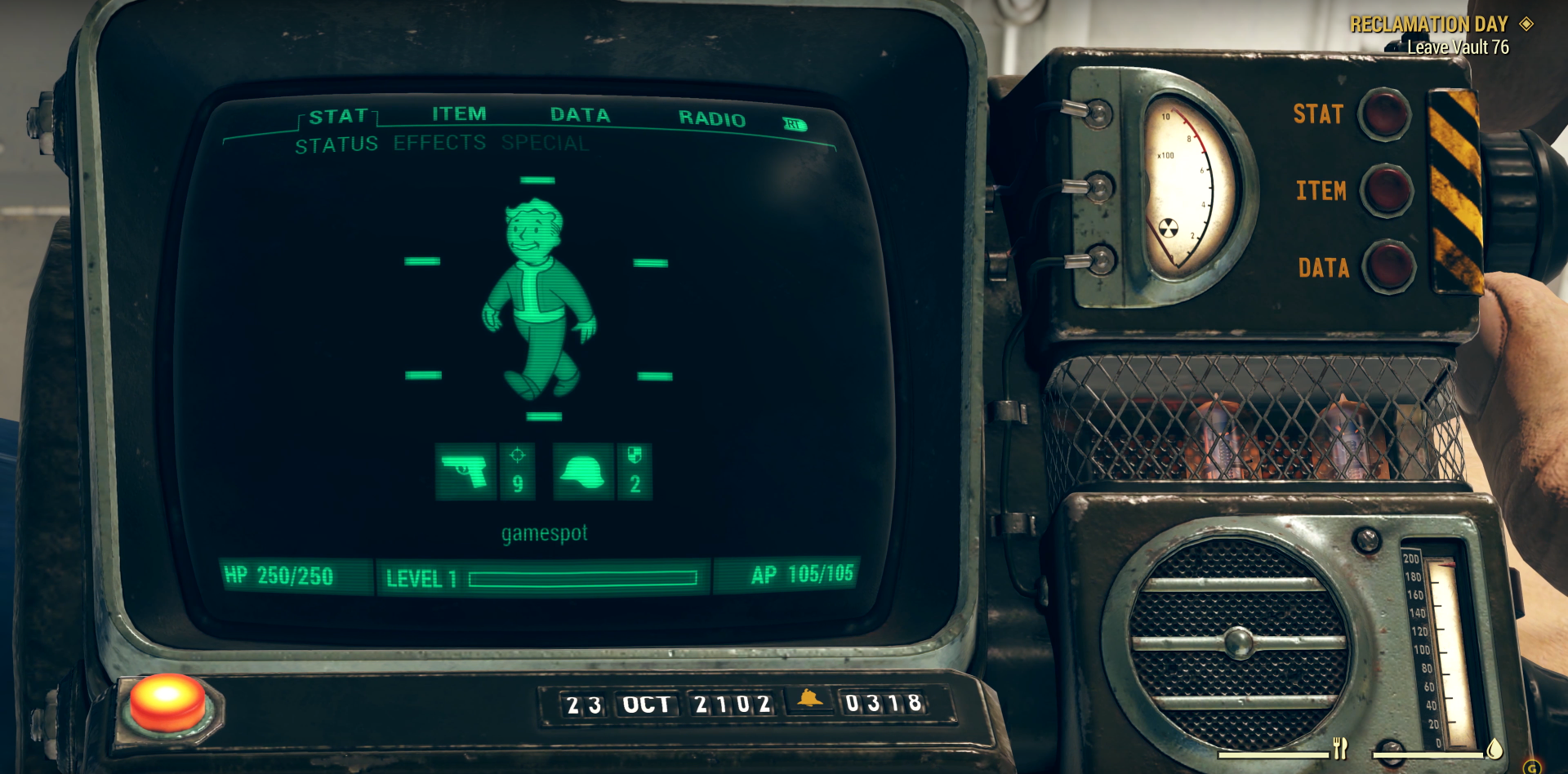 | STATUS | Displays the wearer's current health as compared to the wearer's total health, the wearer's name, the wearer's level, damage output on their current weapon, and damage resistance from their current armor. Health bars for each limb of the wearer are also displayed to show how healthy or damaged a limb may be. The Vault Boy animation on the screen will change depending on whether the wearer has crippled limbs. |