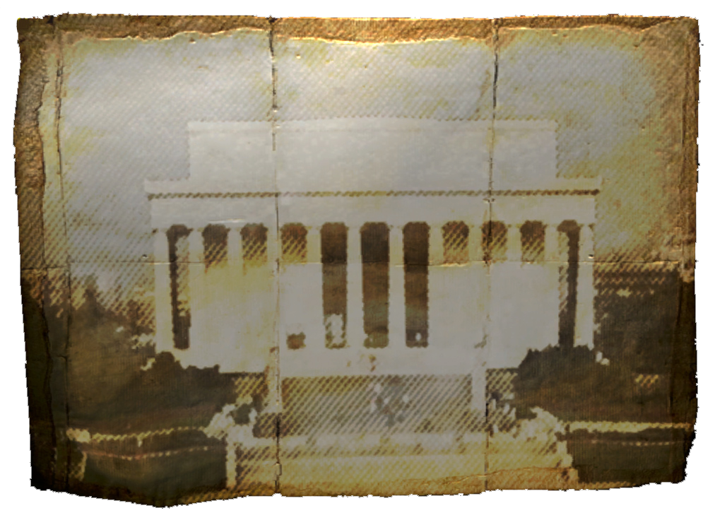 - 凯勒在一楼工作,旁边是一块刻有“联盟圣殿”字样的大石头。很明显,这段文字是一个较长的短语的一部分,但其余的文字模糊得难以辨认。这块石头就是铭刻在林肯头上的墓志铭。全文如下: