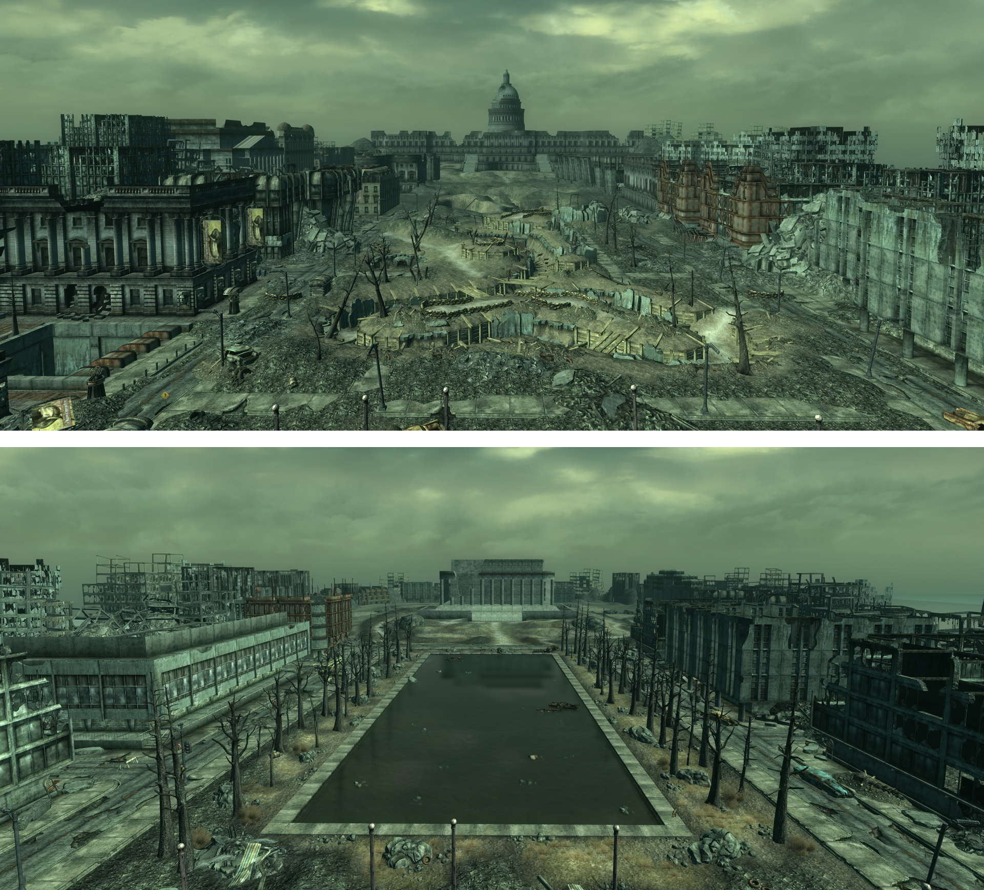 廣場連接遊戲里許多重要建築的通道。正是如此,這裡變成了變種人的第二聚集地,最大聚集地為87號避難所。It is generally believed that the Super Mutants are looking for more FEV to use to reproduce. They are apparently attracted by the radiated reflecting pool behind the Washington Monument or are hoping to find some in any of the old museums or the Capitol Building.