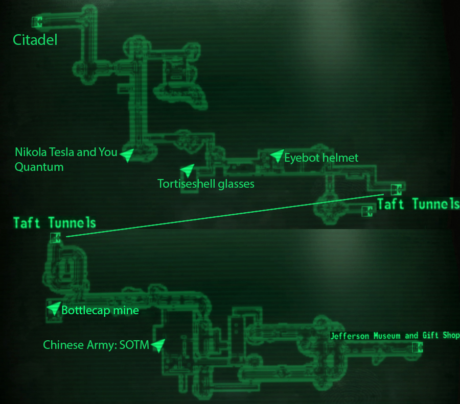 - After completing the game and entering Broken Steel, if you attempt to backtrack through Taft Tunnels to the Jefferson Memorial using the barrel and catwalk trick, you can see through the fenced in area next to the "useless" ladder that the Enclave's force field is still active and blocking the door. (Xbox360)
